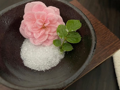秋のバラのシーズンになりました。雨が多いと花や葉に痛みが出やすいのですが、タイミング良ければ足浴にミニバラを添えています♪